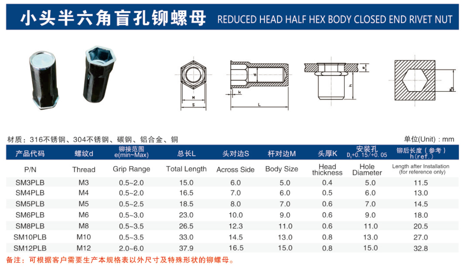 小头半六角盲孔铆螺母是湖南联鑫厂家的热卖产品: