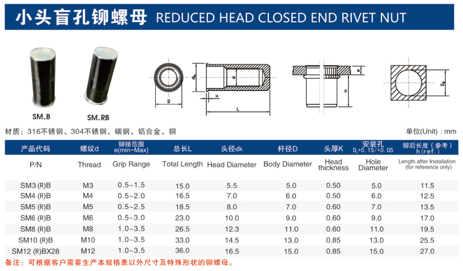 许多人在安装铆螺母时用铁锤或其他冲击方式敲击固定上去的,因为铆螺母用这种安装方式会导致铆螺母受力不均匀,从外表来看是没有丝毫问题的,但实际上压铆螺母的花齿根本没有和板铆合,这样是肯定固定不牢的。安装铆螺母要用专门的安装设备,或者用压力机和冲压设备安装。压铆螺母在使用时只需要简单的一些铆压设备就可以进行快速的安装。铆螺母厂家湖南联鑫生产的不锈钢铆螺母价格低,质量好,交货快。常用的小头盲孔铆螺母、碳钢压铆螺母、镀锌压铆螺母均现货供应。