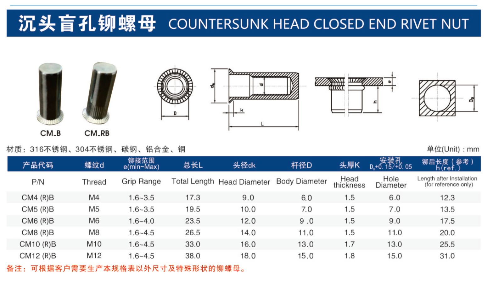 国标中不锈钢铆螺母的规格有M3、M4、M5、M6、M8、M10、M12,实际上推荐使用M6和M8,因为小螺纹的话可以在基材上直接攻螺纹连接,再大螺纹的话螺栓重量大为增加,不锈钢铆螺母的连接强度增加有限,即匹配不甚合理。
